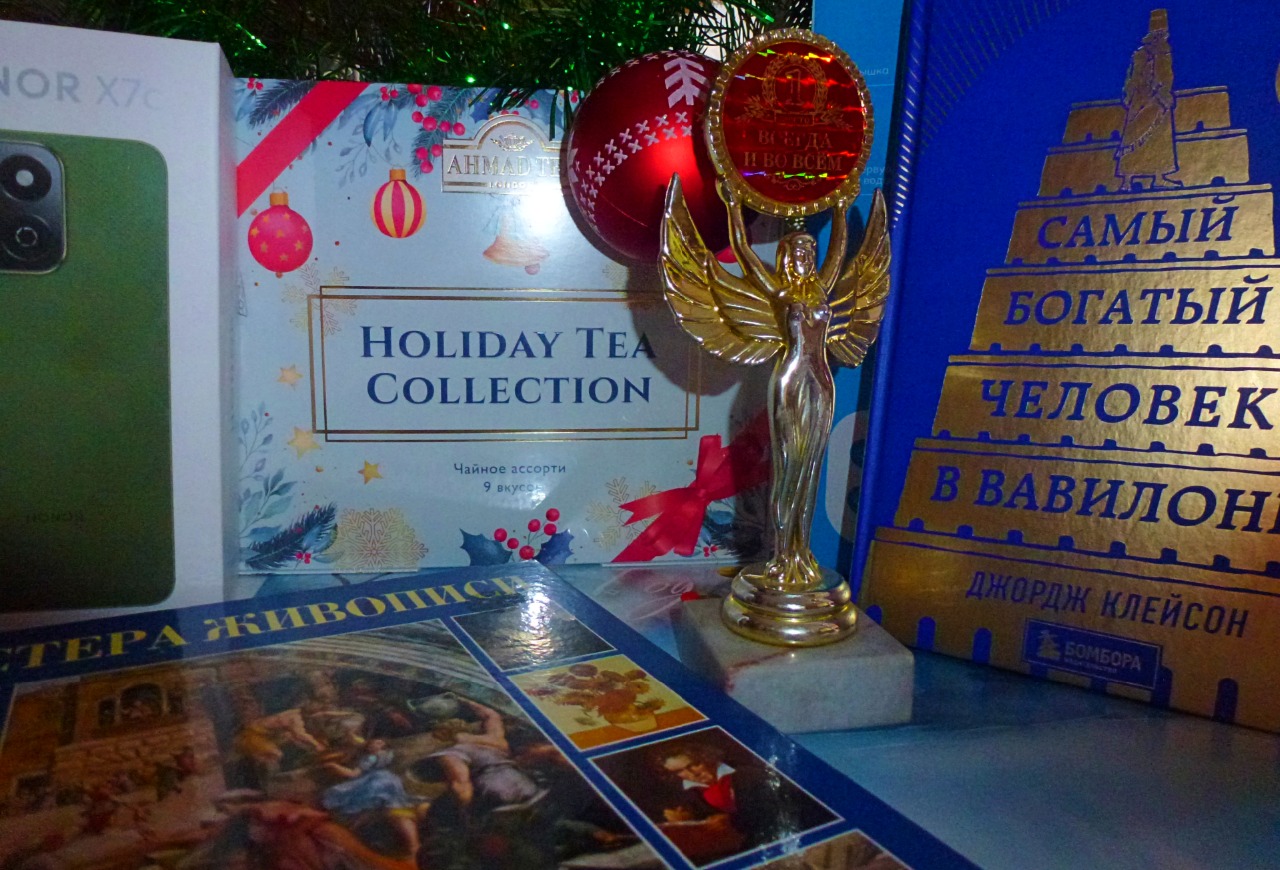 Ценные призы - смартфон HONOR X7, почетный диплом с наградной статуэткой “Приручившему Победу 2026” и статуэткой "Номер 1 всегда и во всём", детские раскраски и книга "Мастера живописи: история искусств", книги и журналы, определялись рандомно и вручены самым активным участникам ))